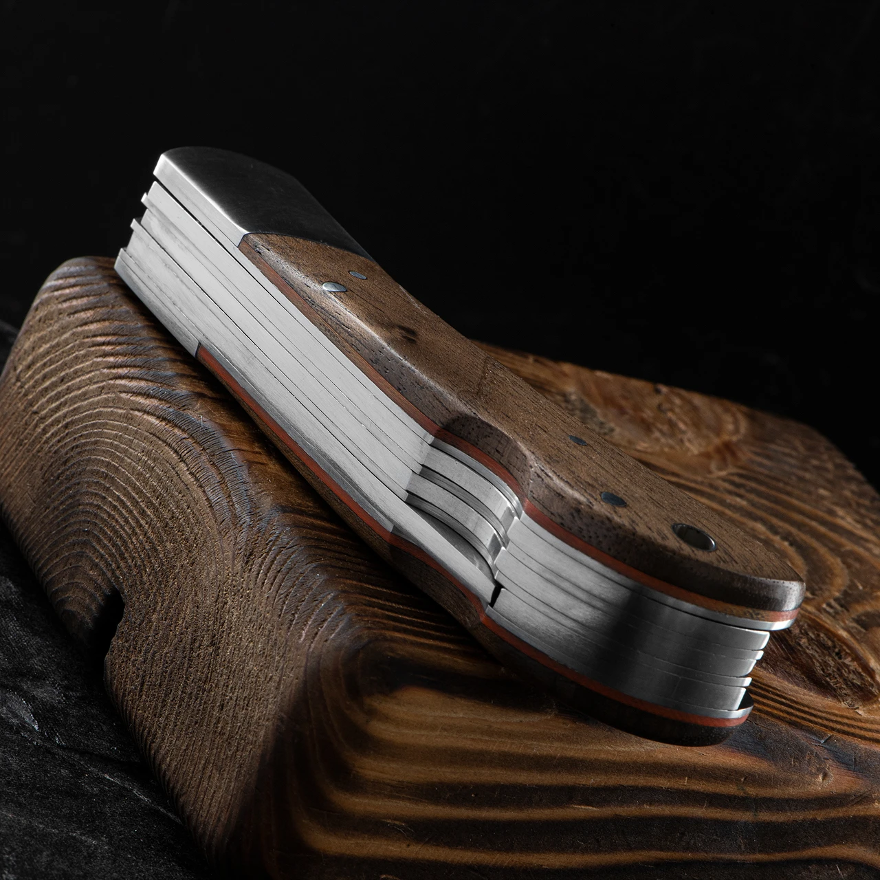 Made in Italy this knife is a quality item made with the uppermost care and attention. This is exemplified by the handle. It is made from Walnut wood with an orange G10 lining. Great to look at and incredibly strong.