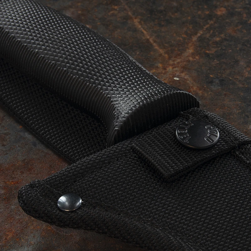 Featuring a rust resistant baked on matte black coating, the fully sharpened and expertly tempered 1055 Carbon Steel blade is safely and securely carried in a sturdy Cor-Ex sheath.