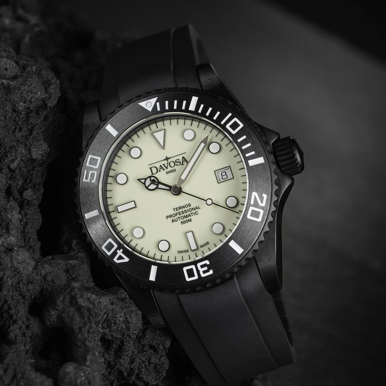 The Davosa Ternos Professional Megalume Automatic is limited to 500 pieces worldwide. At night, the sandy beige dial of the timepiece, illuminates in radiant green. Indexes and hands light up in bright blue. An innovative composition of luminous pigments guarantees the perfect night readability that is so essential for a professional diver’s watch.