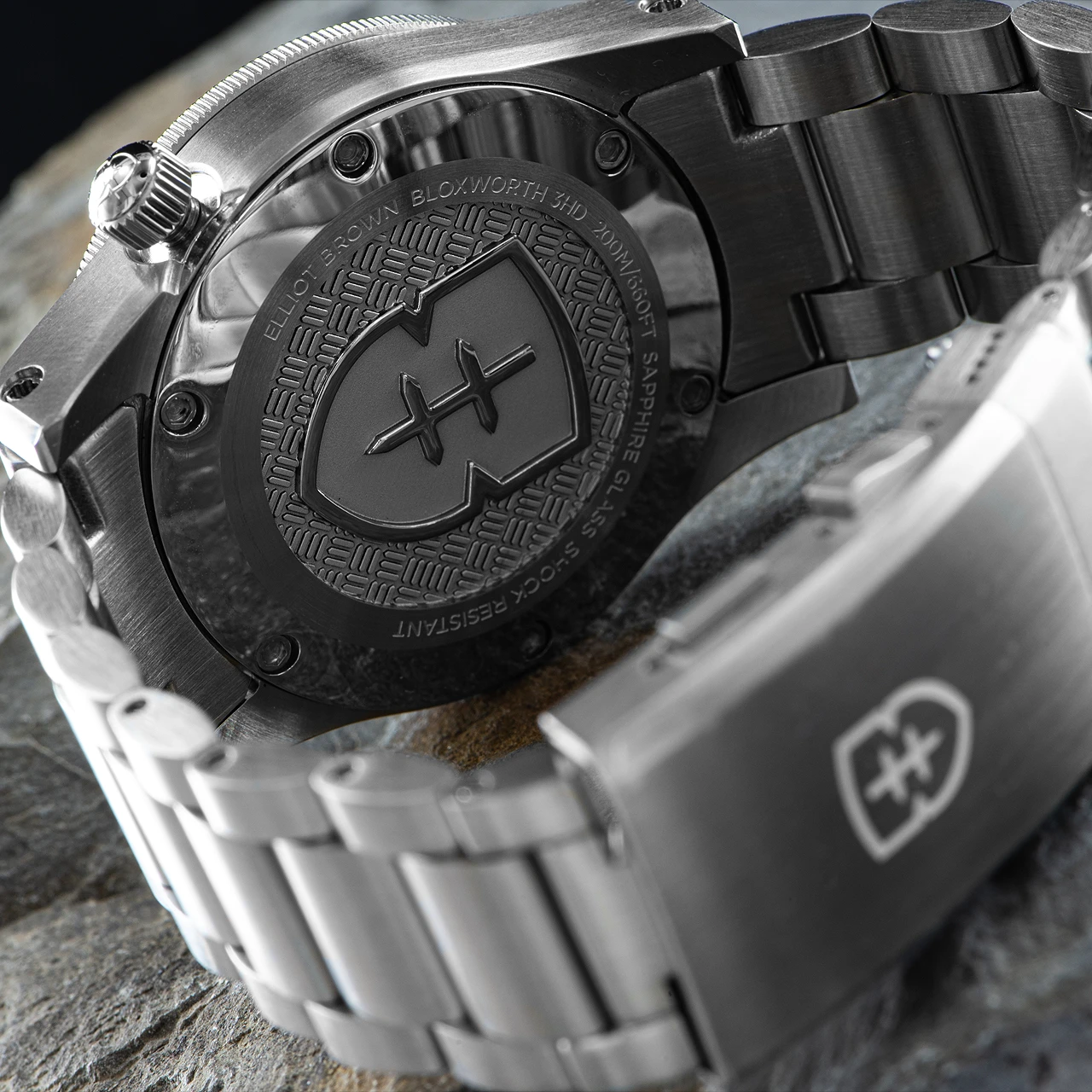 A signature character of the collection is the unique basketweave texture created with part of the Elliot Brown shield subtly embossed into the recessed dial centre. The 316L stainless case is finely brushed with very subtle high polished highlights resulting in just the right amount of ‘pop’ on the wrist. The Bloxworth has a third chamfered surface between the top and side of the case which gives it a more pebble like appearance to reduce the apparent volume of the case lugs. For this 3HD collection the tiny chamfer is polished to tie in beautifully with the polished outer edge of the bezel and classically domed crown at 4H.