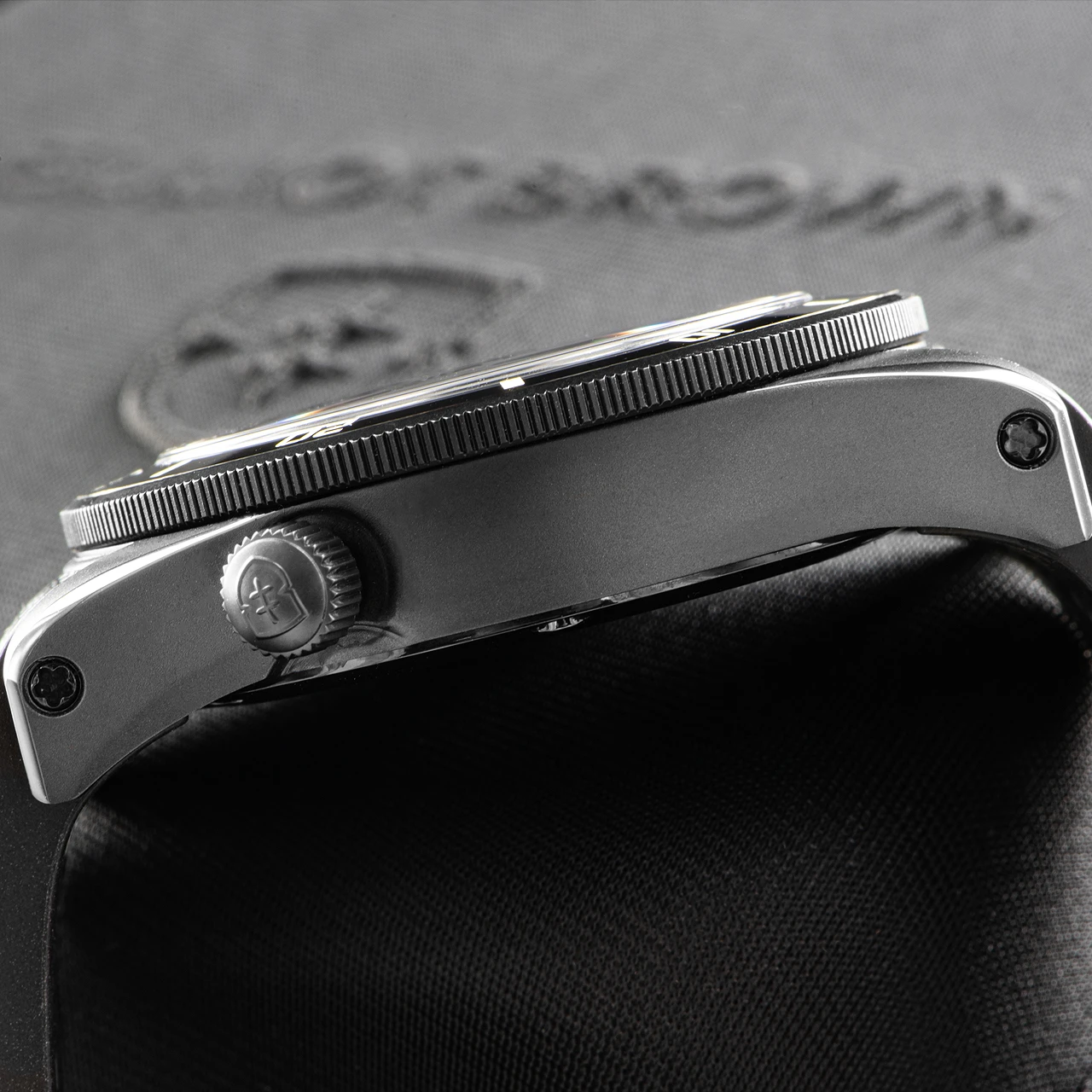 The two layer sandwich dial of this model is discreet with a smooth black central lower layer framed by a subtle chamfer just outside the micro markers. Matt tungsten coloured hands with a warm sand lume colour infill, command just the right amount of attention from the eye, set against the clarity of the ultra bold dial markers. Both glow for up to 8 hours after a good ‘charge’ in daylight for great visibility on all conditions.
