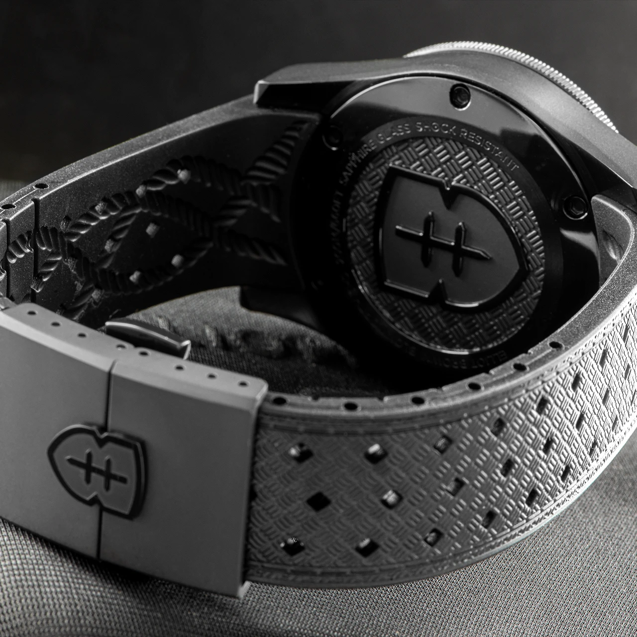 The basket weave texture on the outer surface of the fitted black rubber strap suits this watch so well, sitting flush against the matt case with a subtle border embossed into the rubber to frame the join between the two materials just so. The textured surface is created using elements from the EB logo, which is repeated, then embossed into the soft rubber surface. The rubber strap creation has a story all of its own, with inner breather lines moulded from hand drawn lines and ropes that we see daily in our boat yard HQ. It’s fitted with functional, handsome split deployant buckle with a raised EB shield who’s outer edge is highly polished to match the case highlights. The basket weave continues as the primary background detail on the compressor case back, framing the raised and polished shield with a subtle matt texture.Â