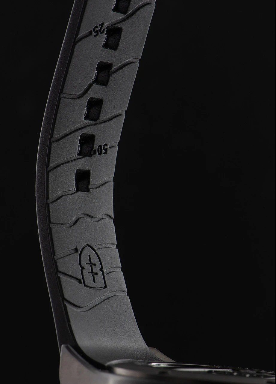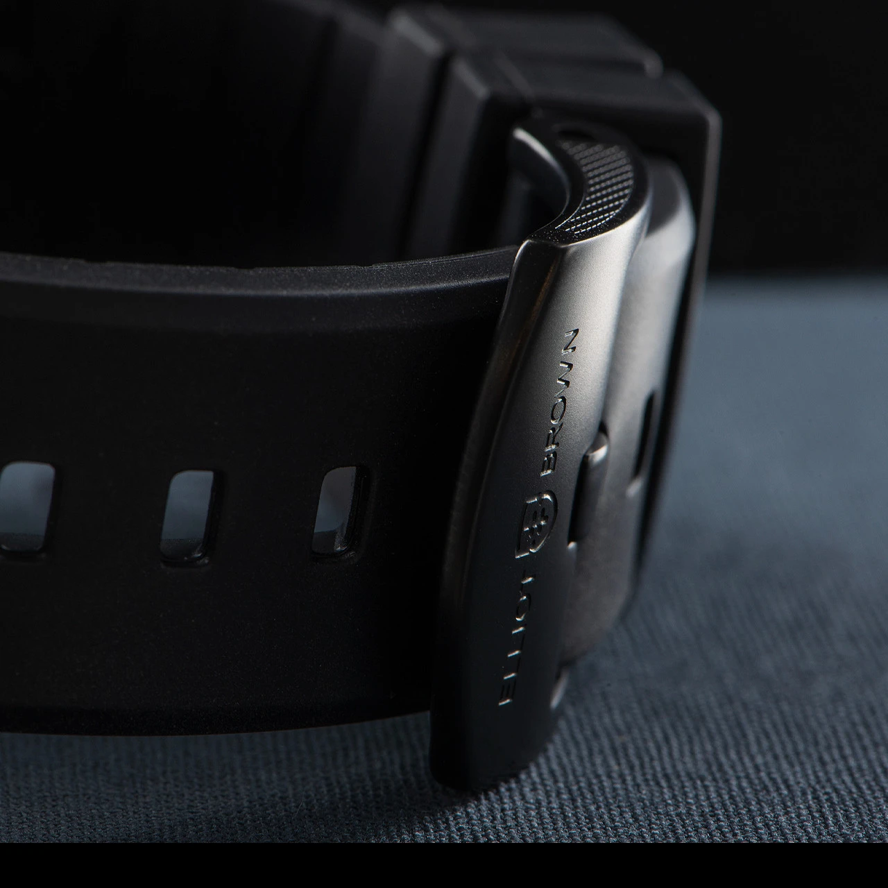 - Black rubber strap with dark gunmetal grey EB tongue buckle