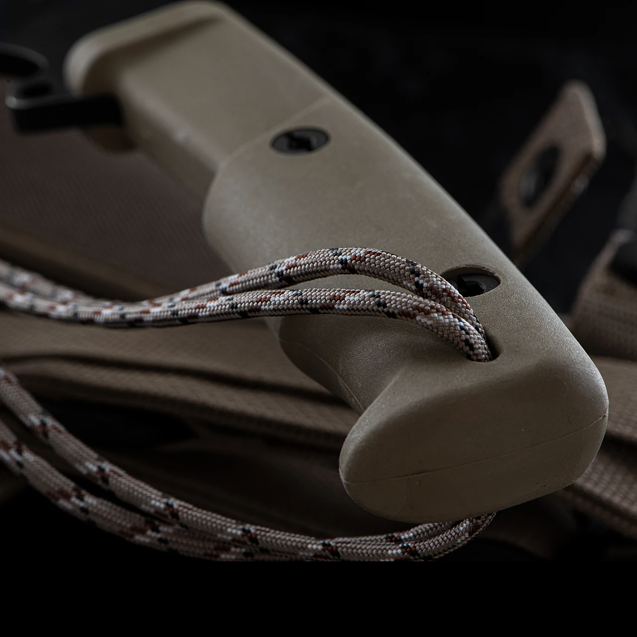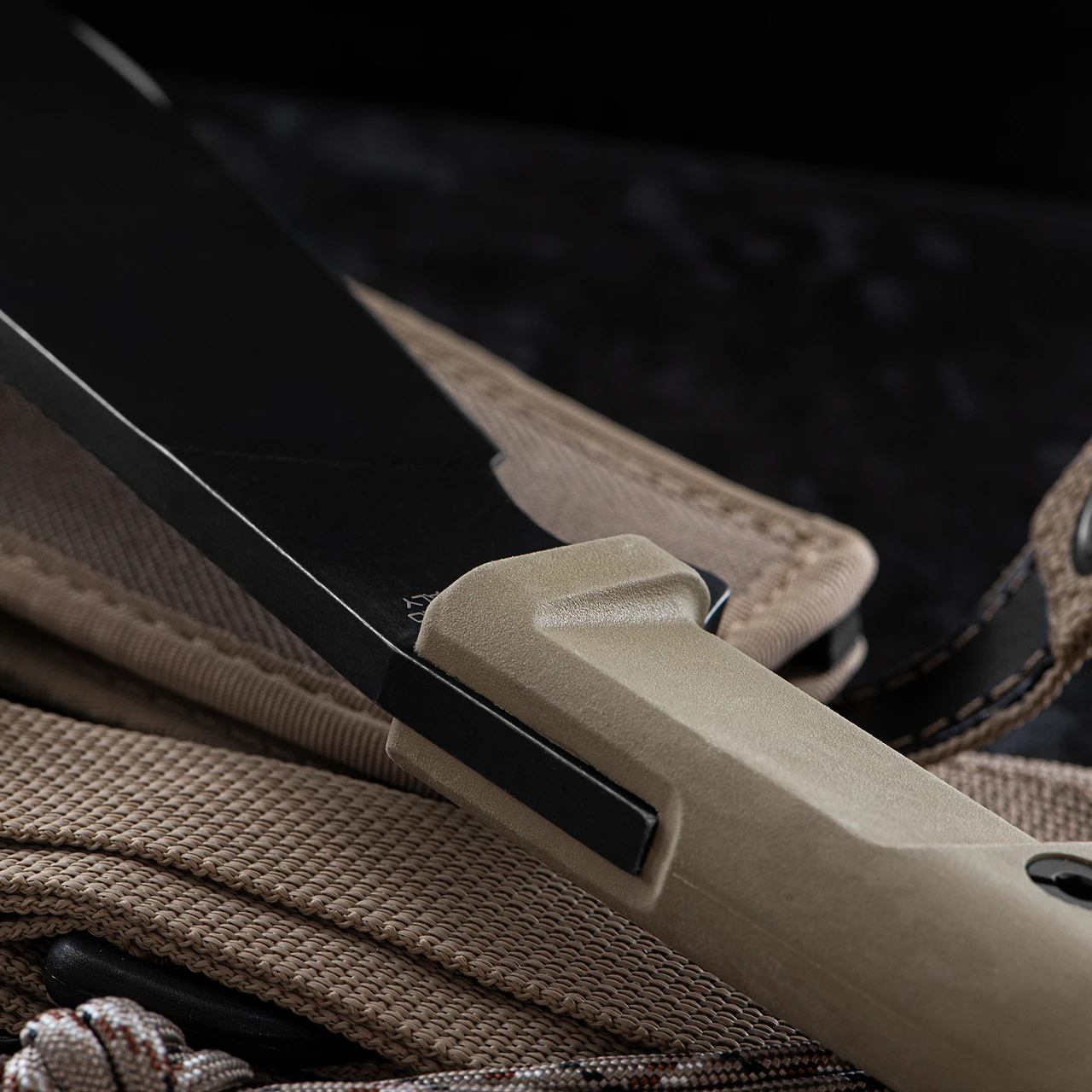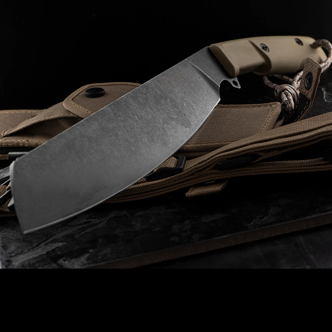 It comes with a desert cordura sheath with MOLLE system, a safety carry shoulder belt, a mini puch containing a paracord with flammable filament, which can be used in case of emergency and/or difficult climatic conditions, and a Firesteel for lighting fires.