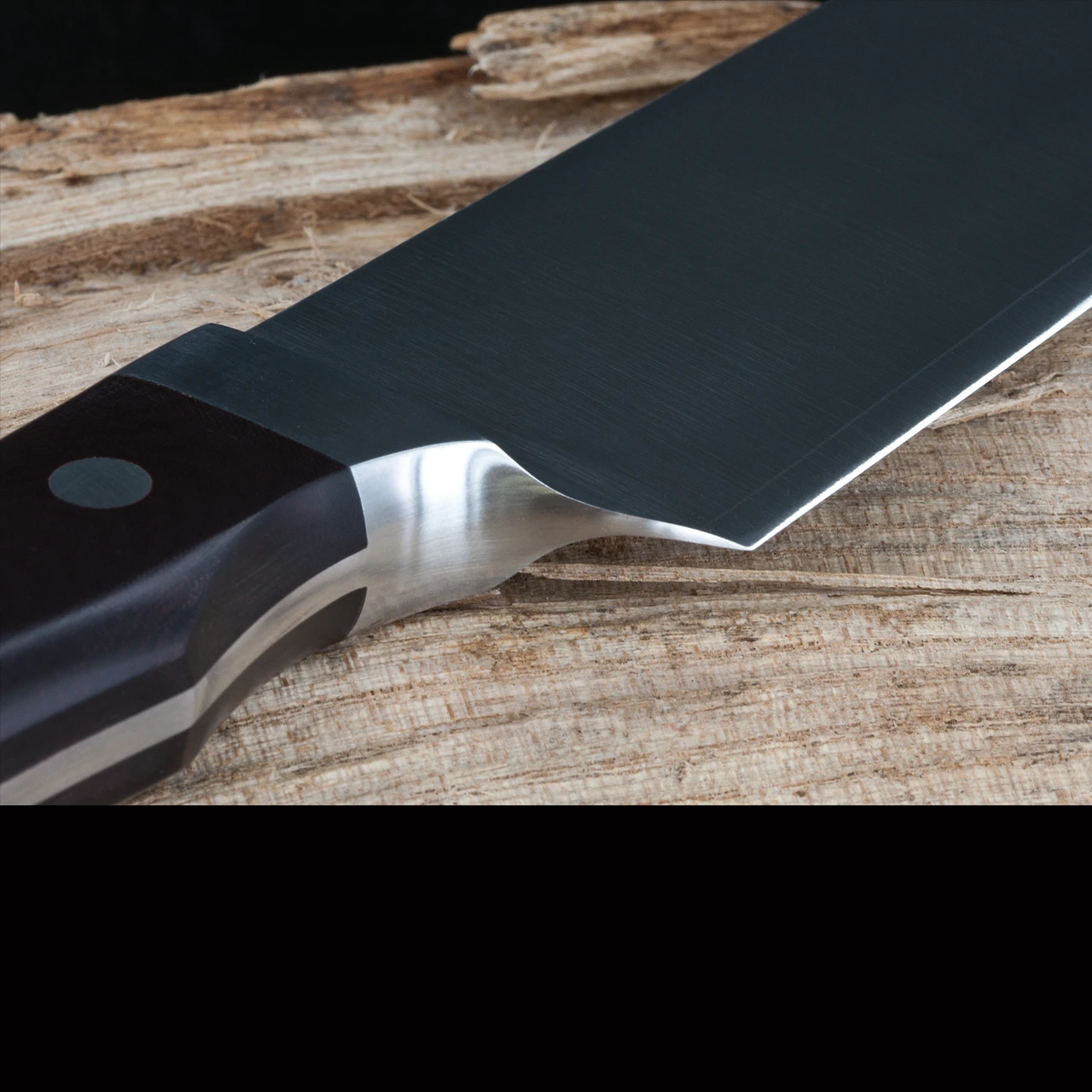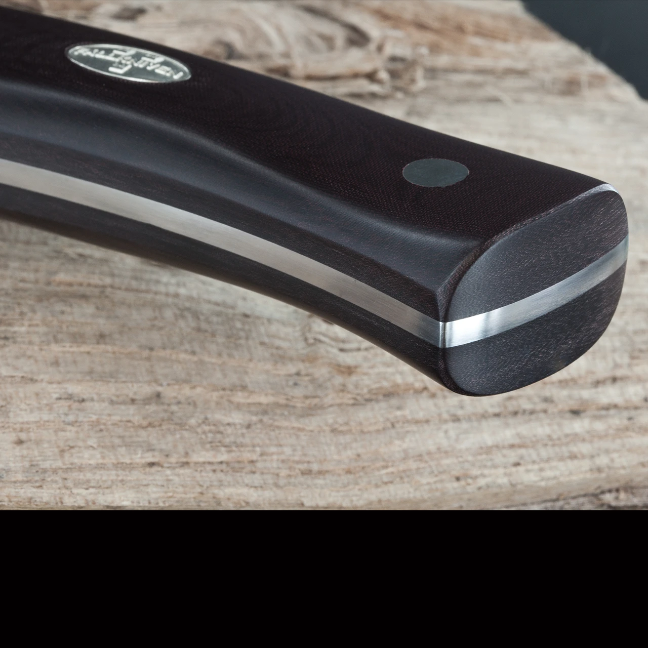 The Alpha is the largest in the range. It has a full tang, strong construction with a convex blade grind. The steel is laminated Cos which will keep an edge longer than any other steel. The handle material is maroon Micarta which will only improve with age and use. It is supplied in a wooden display/storage box.