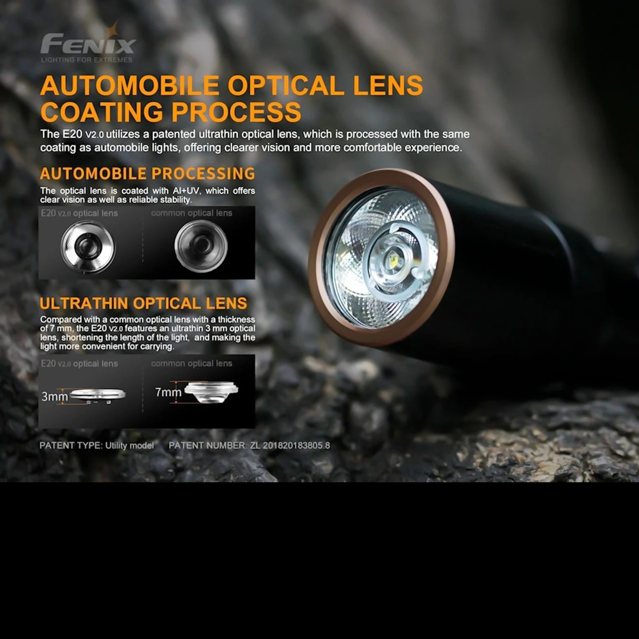 An Ultra Thin (3mm) optical lens with automotive anti reflective coating provides a central beam angle of 12 degrees and a flood beam angle of 85 degrees. This offers a wide lighting area making the torch a superb companion for tradesmen and general every day use where a comfortable close in working beam is preferred. Max beam distance is 126 metres so E20 V2.0 is also capable of reaching out into the distance.