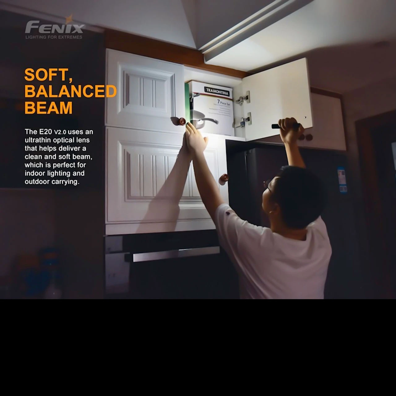 The E20 V2.0 is a compact, premium quality Fenix LED torch powered by 2 x AA batteries and designed for daily use. E20 V2.0 is waterproof to 2 metres depth (IP68) and drop tested to 1.5 metres making this light suitable for the most arduous environments. 4 brightness levels (Eco-Low-Med-High) are cycled using the tail switch with a max run time of 8.3 days at 5 lumens and max output is 350 lumens.