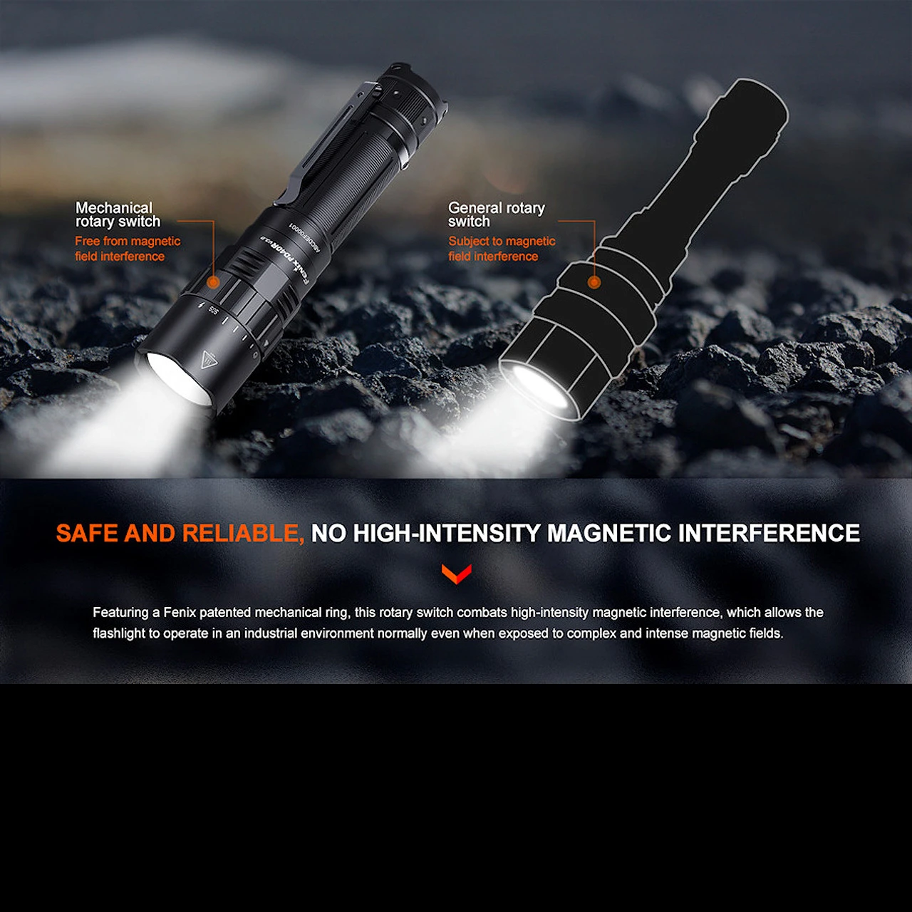The torch is an updated version of the popular PD40R, with the main difference being the 21700 battery which provides improved runtimes. Additionally, the V2.0 model is operated using a rotary switch at the head of the light for smooth and easy mode selection.