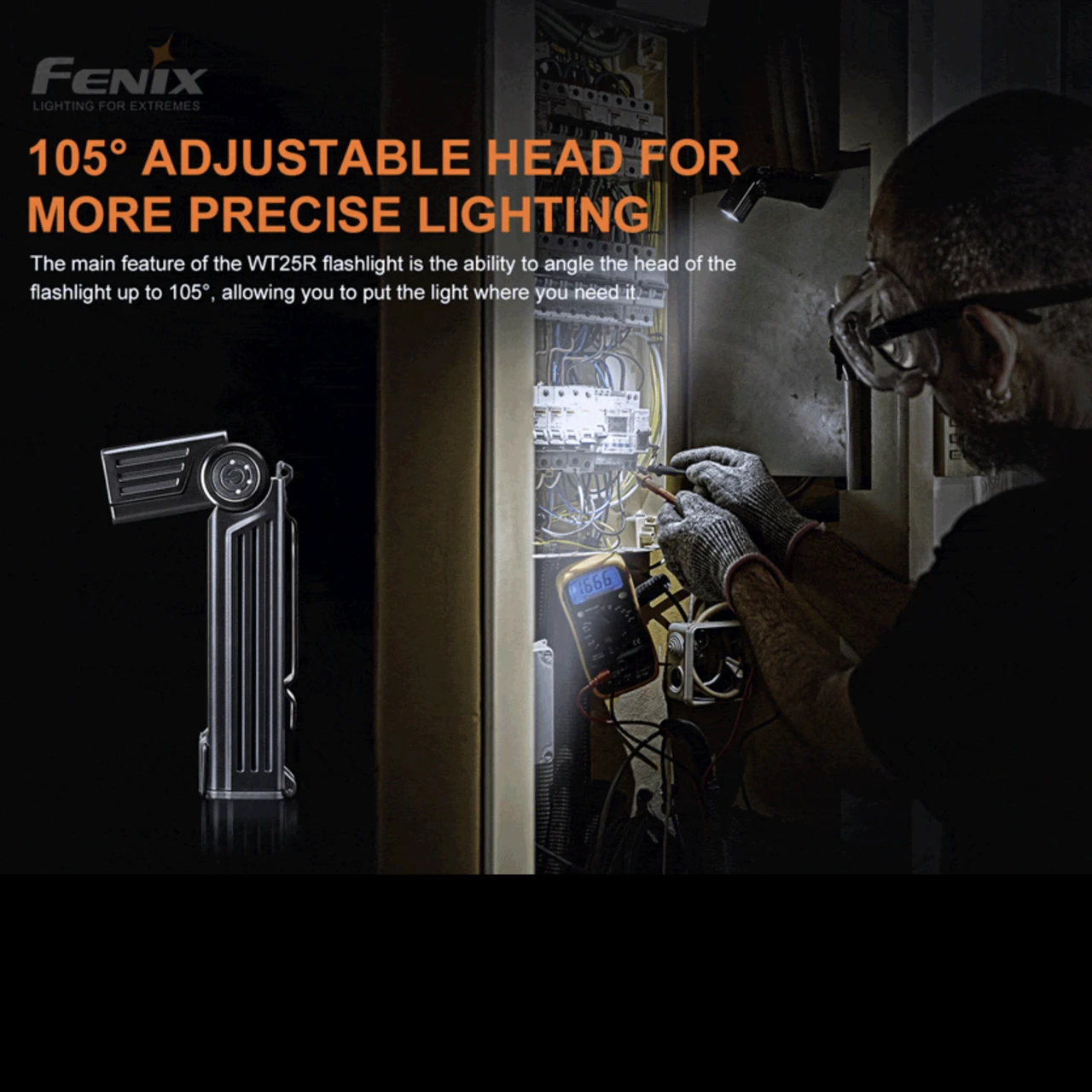 With its tough pocket / belt clip, magnetic base, 105° adjustable head, broad power output rage and socket-free magnetic charging, Fenix WT25R is useful in a multitude of working situations for busy trades people.