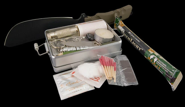It is comfortable, well balanced, lightweight and supplied with a well stocked and thoughtfully put together survival kit. The kit includes all the recommended items including whistle, compass, fire steel, candle, snare, a small blade and much more. Not only that but Fox have also included a 30 minute light stick. The nylon sheath allows all of this to hang from your belt.