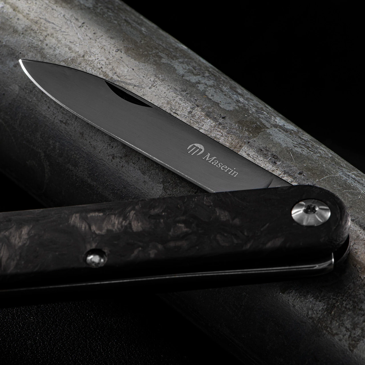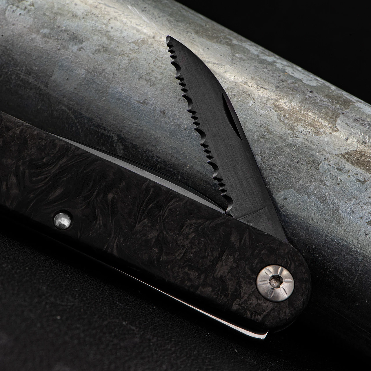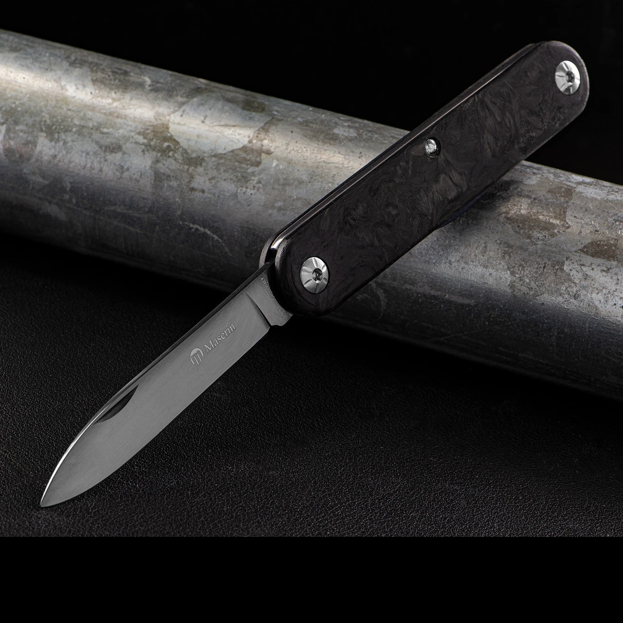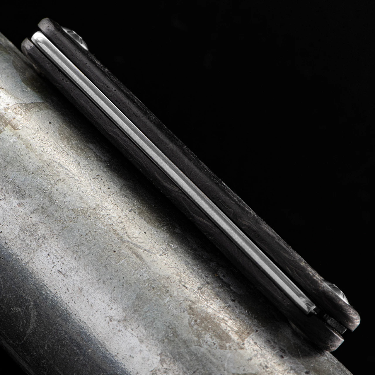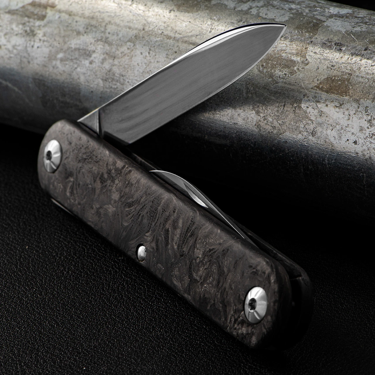 The handle scales of crushed carbon fibre give a depth to this piece which is uncommon in such a useable knife.