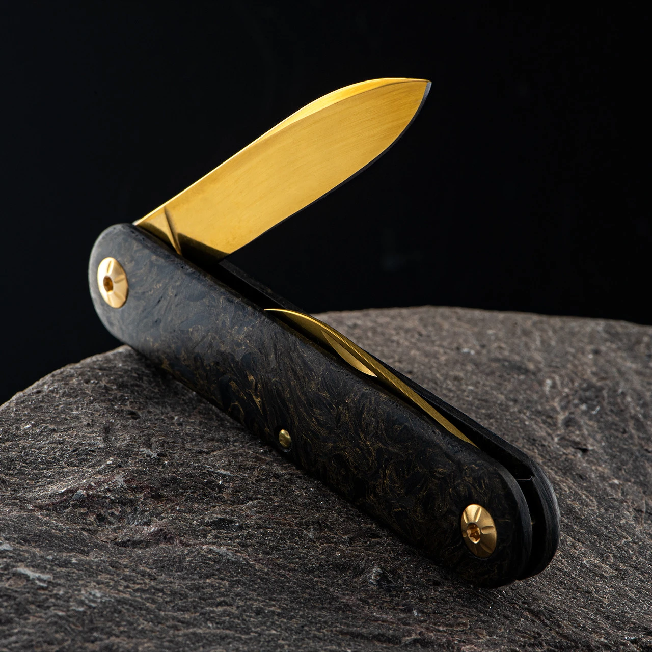 The handle scales of “fat carbon” manage to mix gold with carbon fibre, to give a deeply swirled finish.