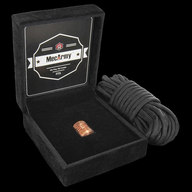The MecArmy FFX Bead is a beautifully crafted copper bead in a “Chinese lantern” design. Also supplied is a 5 metre length of black paracord to make your own lanyards for your knife, flashlight or rucksack. It is supplied in a velvet gift box.