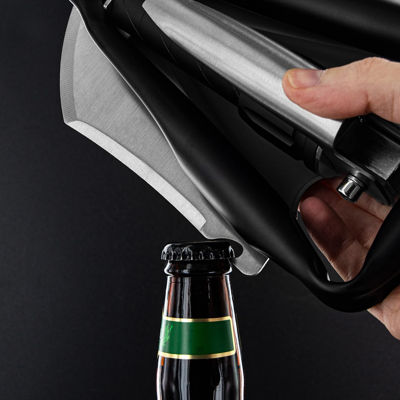 The spade blade is made of very sturdy stainless steel. One edge is v-shaped for digging, another carries a saw blade and rope cutting notch, with an additional bottle opener, should the need arise.