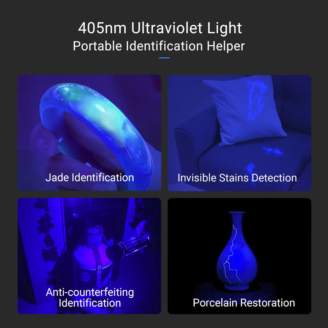 - Includes four LED light sources: White, red, blue, and ultraviolet (UV)
