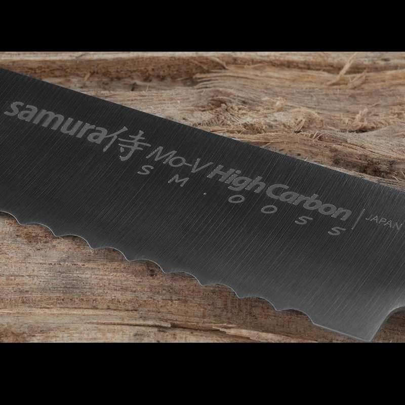 The serrated blade of the Samura MO-V Bread Knife is, of course, a utility knife. As well as slicing easily through your bloomer, baguette or batch loaf, this knife is equally at home with foods having a soft or juicy core, but a hard crust or skin, including pastry, citrus fruits, pineapple, watermelon, etc. Undulating and very sharp teeth delicately saw the crust or skin, without crushing or crumbling the tender core.