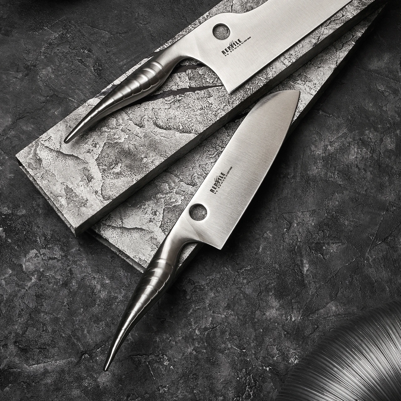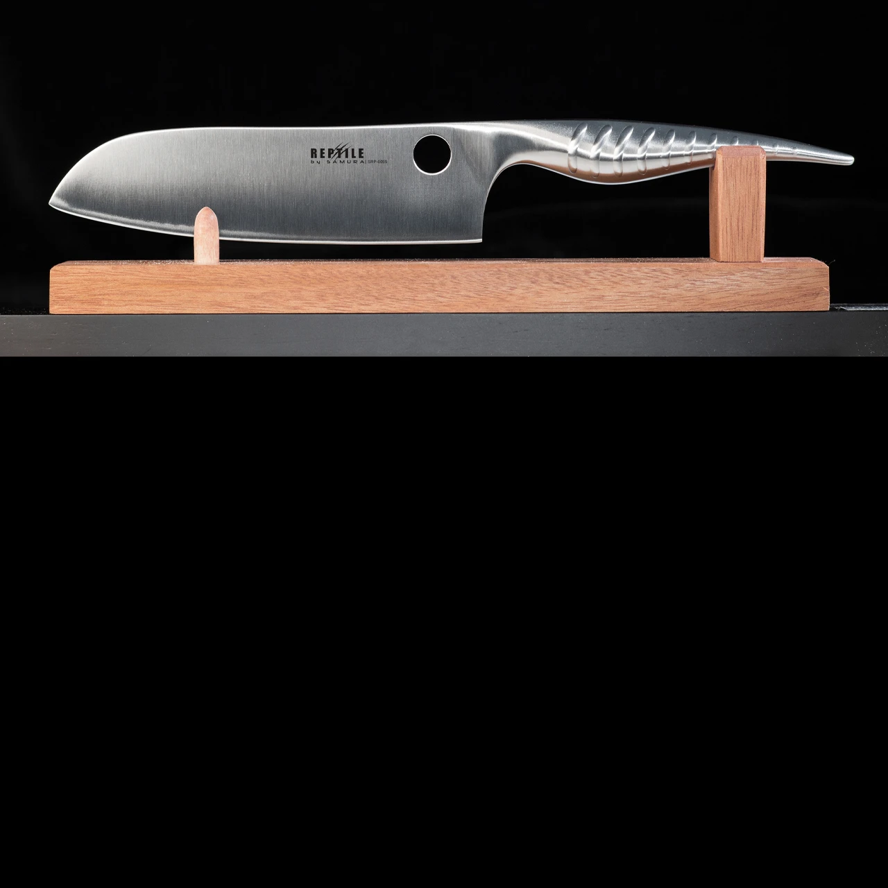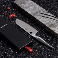 The Samura Santuko Reptile benefits from a AUS10 stainless steel, stain resistant blade. The handle is stainless steel too in a “reptilian” design which will fit right into the kitchen of veggies and meat-eaters alike.