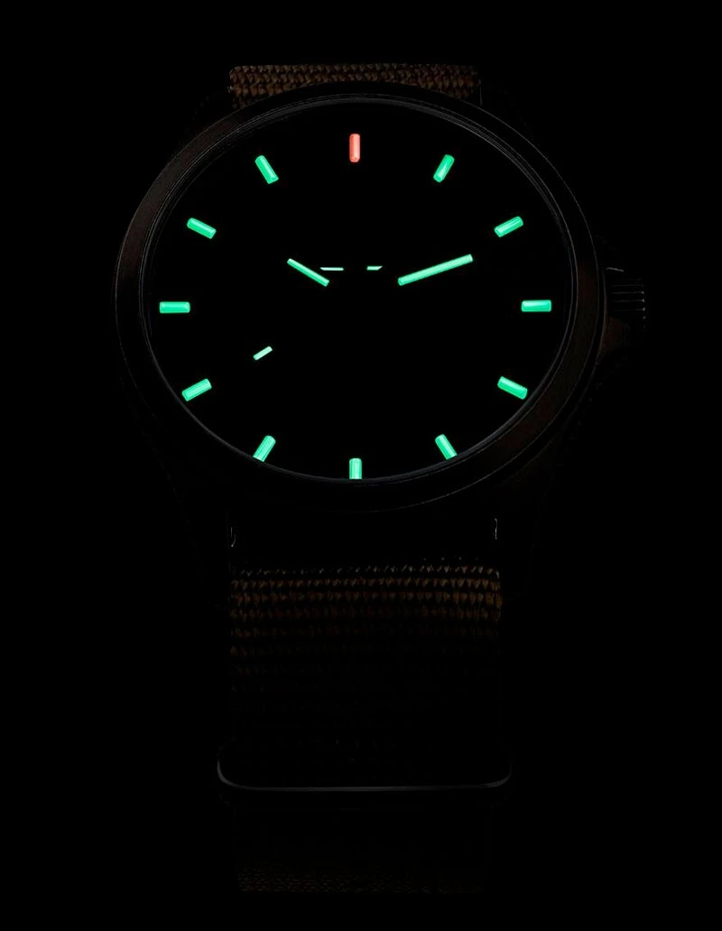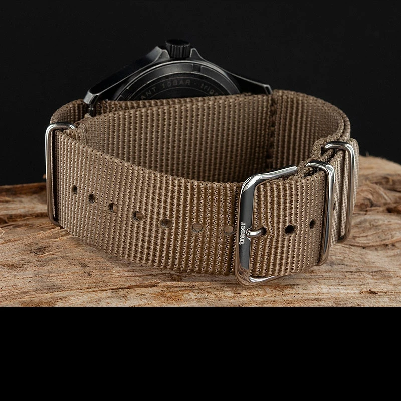 Supplied with a 22mm khaki-coloured NATO webbing strap.