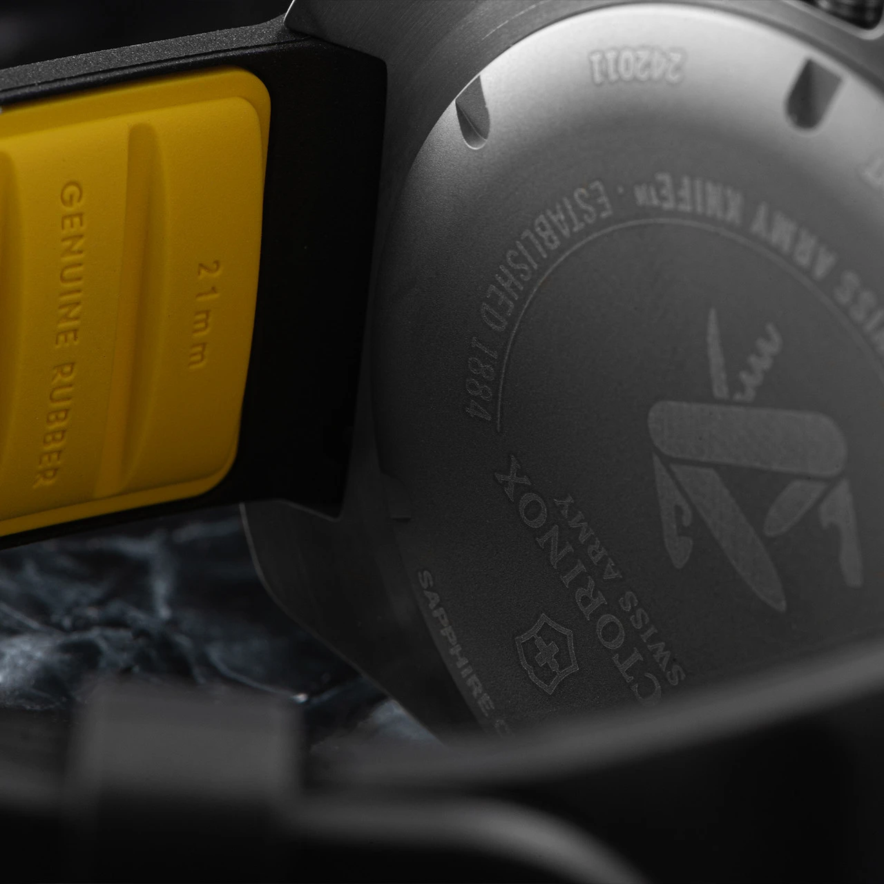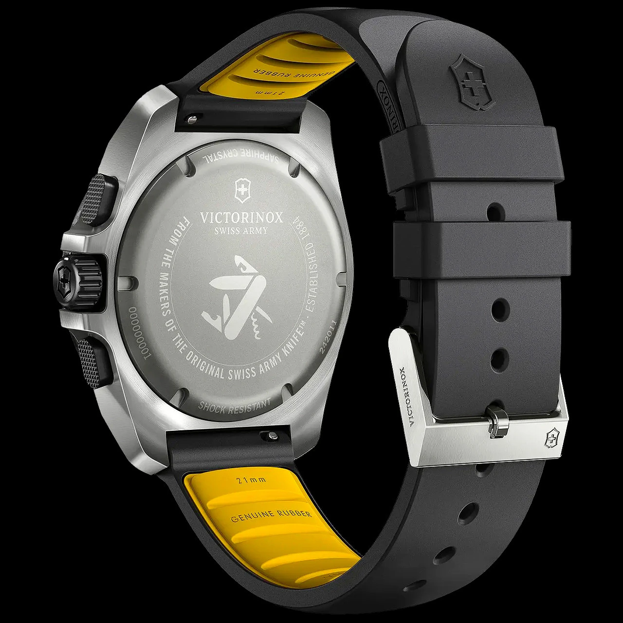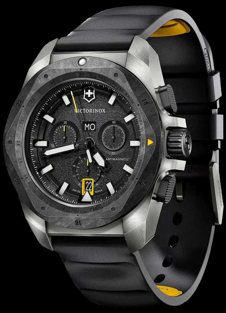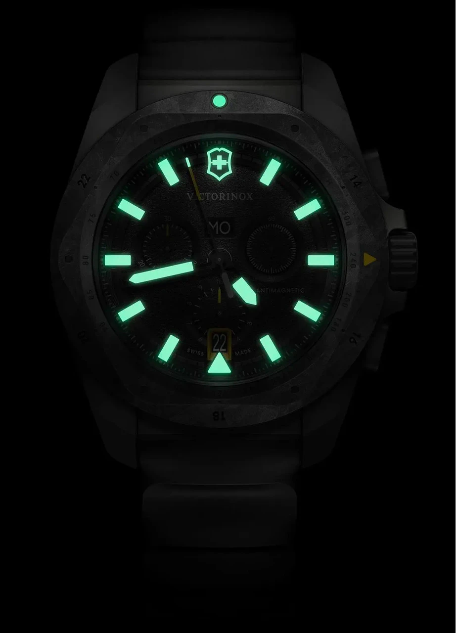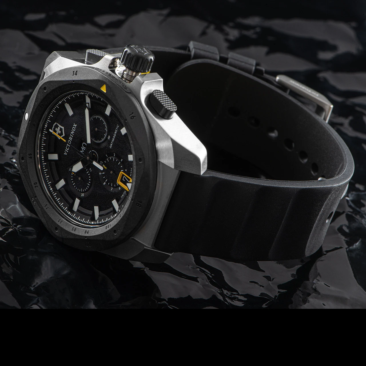 The Victorinox I.N.O.X. Chrono with quartz movement is a peerless timepiece that’s uncompromising on performance. The Swiss made titanium case and carbon bezel ensure flawless accuracy, and the strong geometry exudes understated confidence. With an easy-change rubber strap, it’s swift, sleek and enduringly sporty.