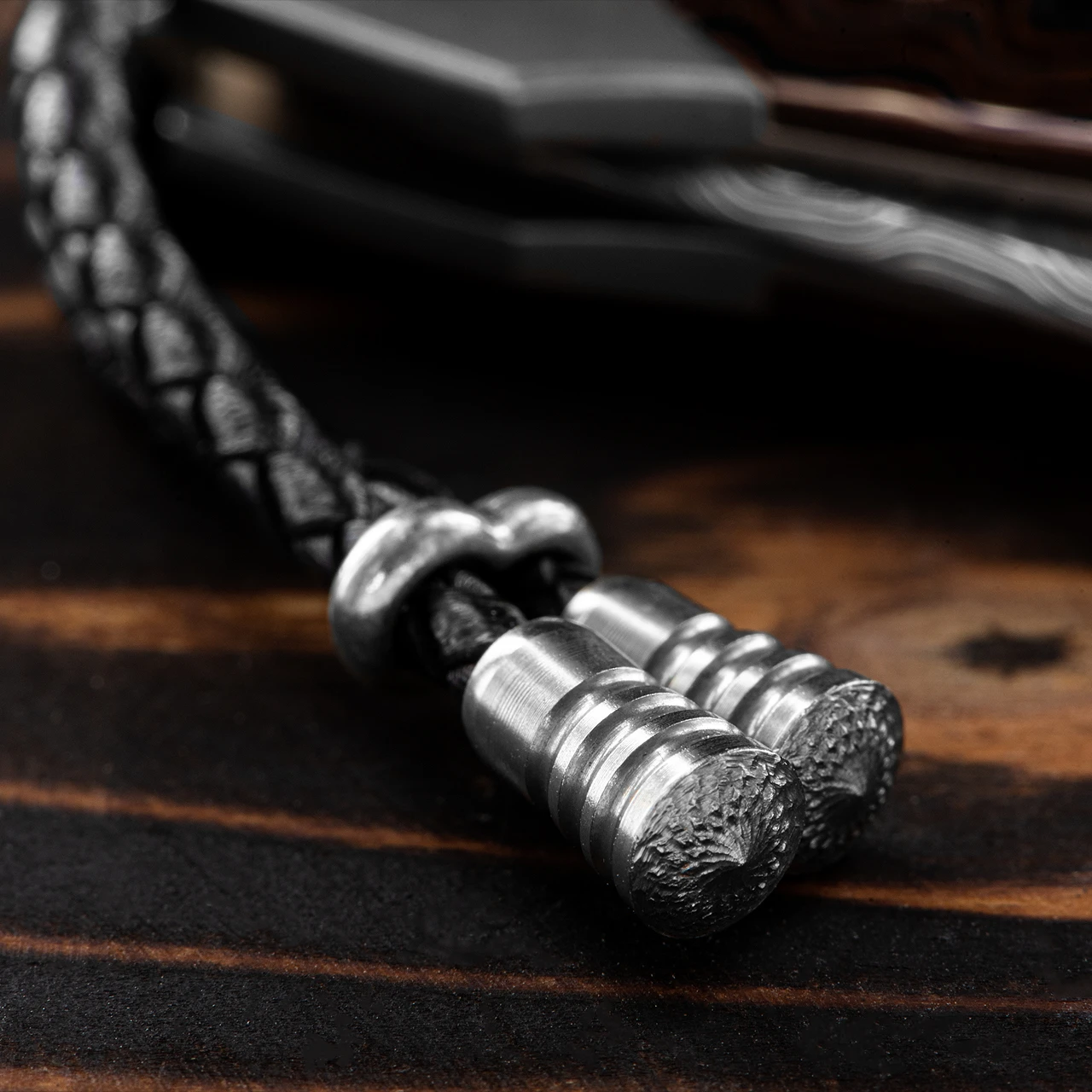 The William Henry Monarch ‘Dark Fire’ features a light and resilient frame which is machined from aerospace grade titanium, then finished with a fine blast-polishing. The unique inlay is crafted from heat-colored ‘Wave Mokume’. The blade is hand-forged ‘Intrepid’ damascus steel by Chad Nichols. The one-hand button lock and the thumb stud are set with London blue topaz gemstones.Â