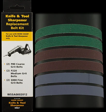 WSKTS Knife and Tool Sharpener assorted belt kit includes:(2) P80 Coarse Grit Belts (2) P220 Medium Grit Belts (2) 6000 Fine Grit Belts. These engineered abrasives from Norton and Micro–Mesh are ½ inch x 12 inch and do not fit other Work Sharp products.